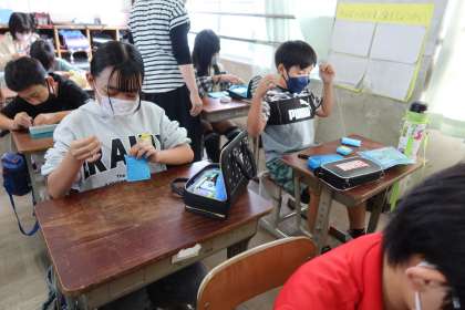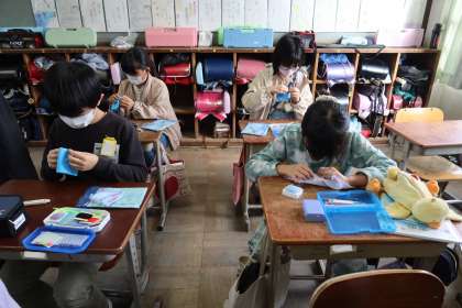 針と糸で作品をつくろうと思います。玉結びや玉どめ、なみぬいなど、しっかり思い出し、作りたいものをつくることができるように、練習布で練習をしました。とても集中してがんばりました。