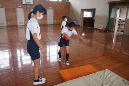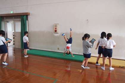 体育の学習でマット運動に取り組んでいます。友だちとペアになって、教え合いながら、たくさんの技が美しくできるように練習を進めることができました。