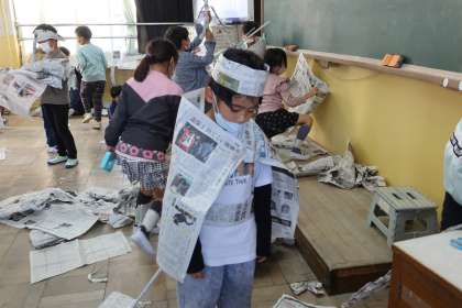 新聞紙を変身させて遊ぶには、どんな方法があるだろう。みんなで話し合い、考えました。切る、ちぎる、丸める、くっつける、折る、かぶる・・・いろいろなアイデアが出ました。実際にやってみると、もっとたくさんの発想が生まれ、子どもたちの新しいアイデアがいっぱいの「しんぶんしとなかよし」の活動となりました。