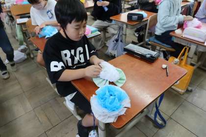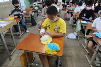 3年生は、いつも地域でお世話になっている見守りの皆さんに感謝を伝える会を行う計画をしました。今、感謝の会の準備で盛り上がっています。花のプレゼントをするために、花紙で花をつくったり、歌の練習をしたり、言葉を考えて練習をしたりしました。それぞれの役割になった子どもたちが、とてもよくがんばっていました。