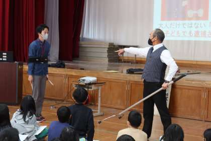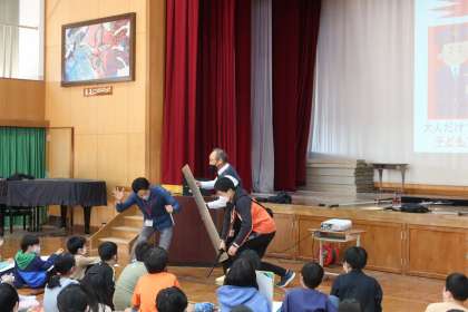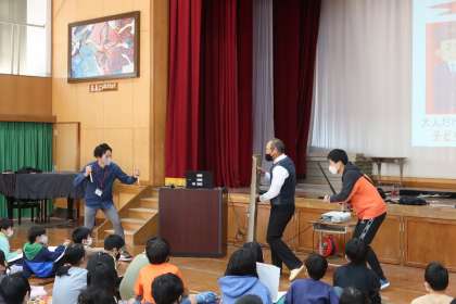 実演は、本物の道具を使っての実演でした。迫力があり、子どもたちも興味津々でお話を聞いたり実演を見たりしました。