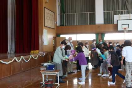 子どもたち手作りのプレゼントを贈りました。全学級の「ありがとうございます」のメッセージを動画にしたものを、見守り隊の方々に見ていただきました。