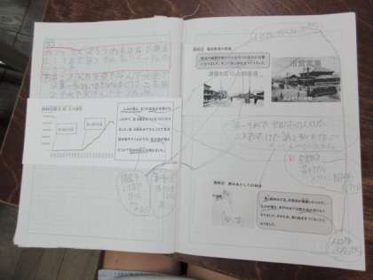 ロイロノートの資料を使わない子は、同じ資料で紙で用意された資料をノートに貼り、考えを書くようにしました。紙の資料も、自分の予想を基に選ぶことができるようにしました。ノートの書き込みもよく頑張っていました。ロイロノートに書き込んで考えた子も、ノートに書きこんで考えた子も、自分で考えた後は、クラスみんなで考えを出し合いました。