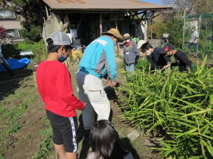 ショウガが育っているところで、畑の先生がショウガを掘り起こしてくださいました。たくさん実がついている様子にびっくり。一つの種の実がたくさんの実をつけることを教えてくださいました。そして、人はバランスよく食べることが大事、いろんな野菜を食べること、野菜や穀物、お肉など、バランスよく栄養を取ることが大事、というお話をしてくださいました。