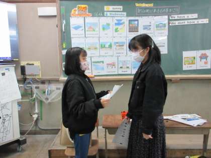 「We have a 〜」の話し方で、松尾の町にあるものとないものを伝えあいました。