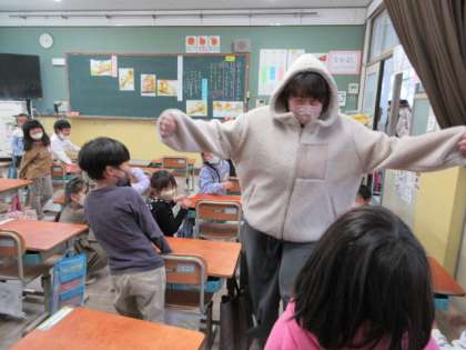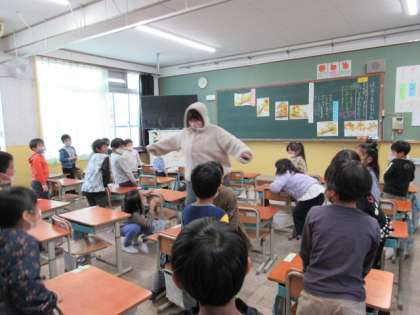 親切にする心について考えました。橋の上で大きなくまさんに出会ったオオカミさんの気持ちを考えるとき、先生が大きなくまさんになりました。主人公の気持ちを考えることを通して、親切にすることについてしっかり考えることができました。