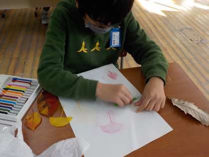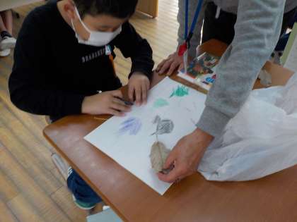 葉の裏表やクーピーの筆圧にも注意しながら丁寧にこすっていました。