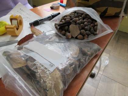 「秋みつけ」でドングリやきれいな色に変わった葉など、たくさんの宝物を集めてきた1年生。秋ともっとなかよしになるために、おもちゃなどをつくります。