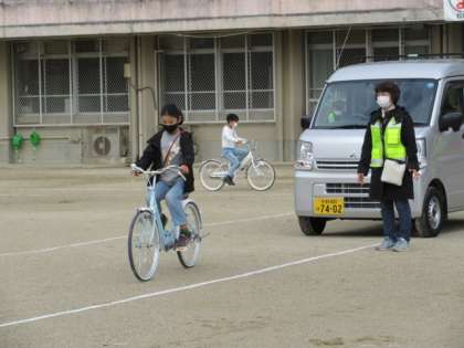 運動場で、安全に自転車で走行する学習をしました。実際に自転車に乗って、止まっている車の横を通るときや、信号を見て道を渡るときなど、気をつけなければいけないことを確かめながら自転車で走行しました。
