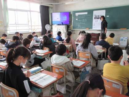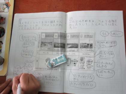 生活の道具の移り変わりと、京都市の移り変わりとの関わりを通して、生活の道具と人々のくらしはどのように変わってきたのかを考えました。資料を基にノートに考えを書きこんで、しっかり考えることができていました。人口のうつりかわりと関連させて、道具の変化を考えていました。