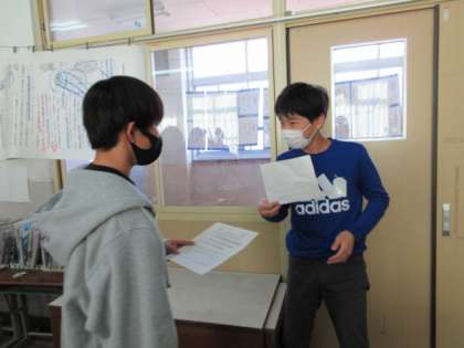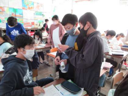 町を紹介する学習をしています。「We have 〜」「We can 〜」を使って、「ご当地クイズ」をつくり、交流しました。短い時間で文をつくり、積極的に交流しようとした6年生。たいへんよくがんばっていました。