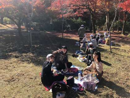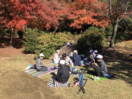 お弁当タイムになりました。紅葉の美しい中でのお昼ご飯。おいしく食べています。