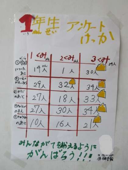 今日の委員会の保健委員会では、アンケートの結果を集計し、まとめました。「いつ手を洗うのか」というアンケート結果を、その学年の手洗い場の壁に掲示しました。健康を守るために大切なことを、いろいろなかたちで伝えようと、がんばっていました。