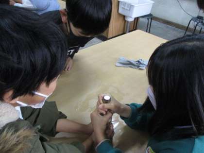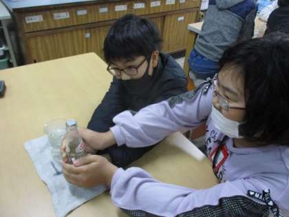 理科の学習では、温度によって体積が変わるのかを実験を通して学習しています。昨日は手でビンを温めてせっけんの膜を膨らまし、1円玉を動かす実験を行いました。動いた瞬間クラスみんなが大喜びしていました。