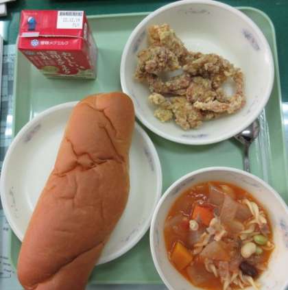 今日の給食「スパイシーチキン ミネストローネ あじつけコッペパン」