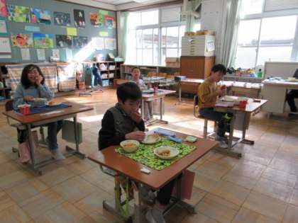 どの教室でも、子ども達は、とてもおいしそうに給食を食べていました。チキンは、カレーのスパイシーな香りが食欲をさらに高めてくれました。ミネストローネは、マカロニの白と、ニンジンの赤、スープの赤の色どりがきれいでした。食べるとトマトの旨味と、玉ねぎの甘味も感じました。