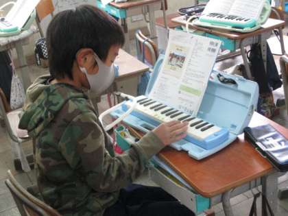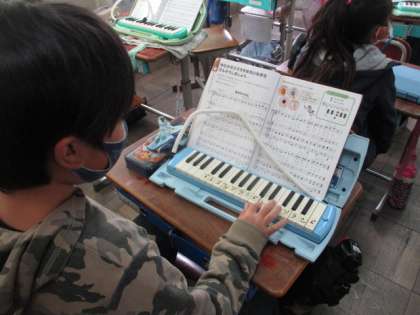 音楽の授業では、「ちゃいろのこびん」という曲の合唱に向けて、鍵盤ハーモニカで主旋律の練習をしています。休み時間にも一生懸命練習する姿が見られました。