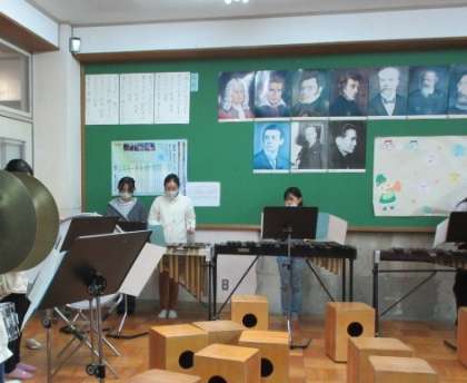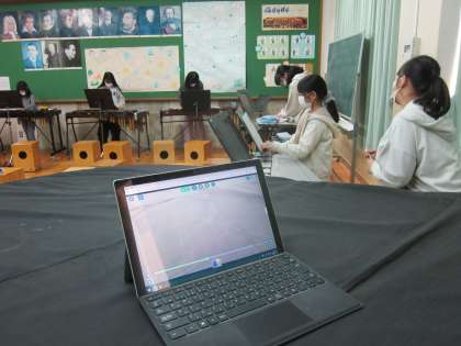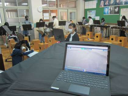 音楽クラブでは、みんなで難曲の合奏に取り組んでいます。異学年の仲間で力を合わせて合奏しています。自分たちの合奏の完成度を確かめるために、GIGA端末を使って録音・録画し、あらためて聞き直すことで次の課題を見つけるようにしました。客観的に見たり聞いたりすることで、練習にさらに力が入りました。各パート4年〜6年のグループをつくり、6年生を中心に声をかけたり練習をすすめたりしてがんばっています。子ども達の主体的に活動する姿が見られました。