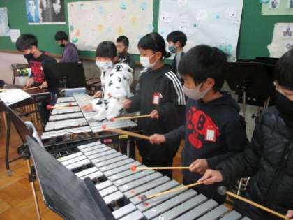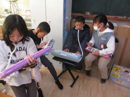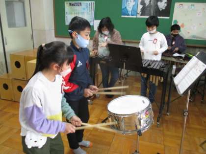 音楽の学習では、茶色の小びんの合奏練習が始まりました。それぞれ前の時間に決めた担当の楽器に分かれて、自分と同じ楽器の人と集まって練習をしました。最後には全員で集まって合わせて合奏をしました。