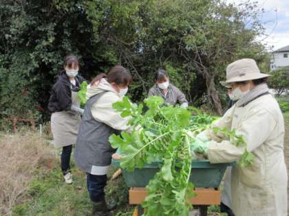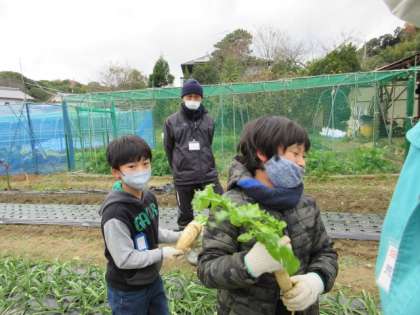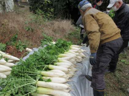 中には小さな大根もありました。「ぼくの小さい。」とつぶやいた子に「小さい大根は、おいしさがギュッと詰まってるから、おいしいよ。」と地域の方が言ってくださり、子どもはにっこり。たくさん収穫できました。地域の方が、洗って泥を落としてくださいました。