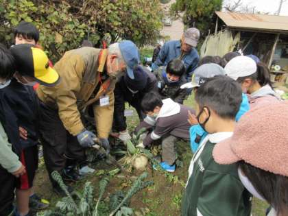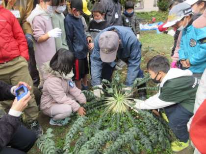 桜島大根の収穫も体験させていただきました。創立150周年記念栽培で、種から育てた桜島大根。葉だけでもとても大きくてびっくり。地域の方と子ども達が一緒に収穫をしました。