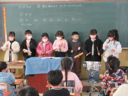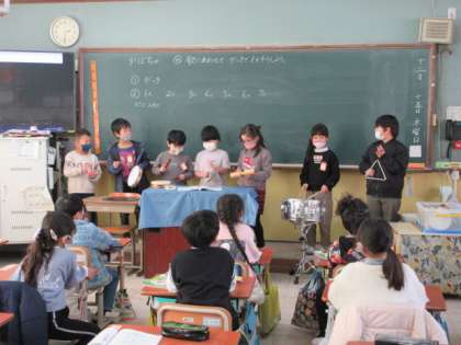 グループごとに発表をしました。演奏する子ども達は集中して、自分のパートになるとしっかり演奏することができました。聞く子ども達も、興味をもって集中して聴いていました。いろいろな楽器の音が重なる楽しさを感じることができました。