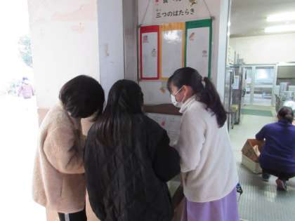 全学級が給食を返しに来た後に、給食委員会の子ども達は、次の日の献立の展示の用意をします。献立に合わせて、使われている材料の絵カードを、たくさんのカードの中から探し、ホワイトボードに貼ります。カードがとても多いので、探すのが大変そうです。でも、見つけるまでがんばっています。下級生や教職員など、いろいろな人が、給食室前の献立を見ていることを知っている委員会の子ども達。「見つけるまでがんばる。」と言いながら最後まで仕事をやりとげています。今度、給食室の前を通ったら、ぜひ、献立とその材料をチェックしてみてください。