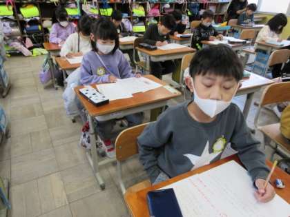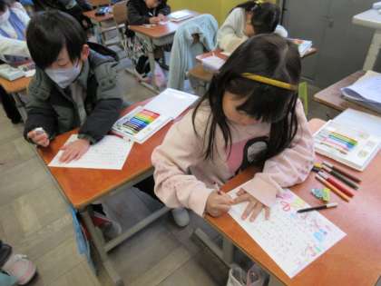 なかなか会えない人に、学校で楽しかったことや知らせたいことをお知らせする手紙を書いています。おじいさんやおばさん、幼稚園や保育園の先生に書いているようです。なかなか会えないわけではないけれど、おうちの人に手紙を書きたくて、おうちの人に書いている人もいます。今日は、下書きで書いた文章を、清書しました。ていねいに、ゆっくり、きれいな字になるよう気を付けて、しっかり書くことができました。