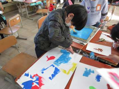 図画工作で、かたがみを使った版画の作品をつくりました。色をローラーでつけると、きれいな形がうかびあがりました。ローラーで色をつける活動が楽しくて、活動に集中し、夢中になる様子が見られました。