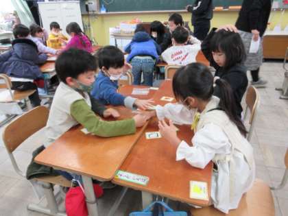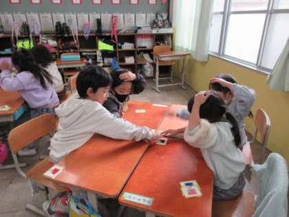 いろいろな色を英語で伝えあう活動をしました。色のカルタをしました。何色かよく聞いて、元気いっぱい活動しました。
