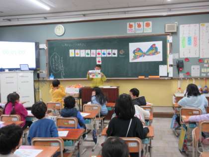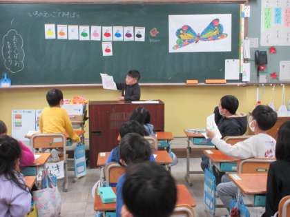 最後に、クラスのみんなに、自分が色と付けたちょうちょを紹介しました。気持ちを込めて色をぬったので、みんなに見てほしい気持ちがいっぱいでした。積極的に発表することができました。みんなも発表をしっかり聞くことができました。