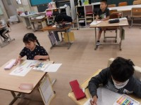 先日地面となる模造紙に色をつけました。ここには動物を置こう、乗り物を走らせたい、など自分たちがつくりたいものを想像し、みんなで話し合いながら制作をすすめていました。