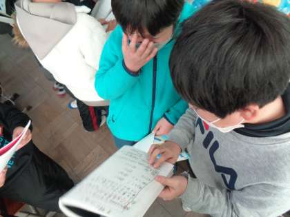 算数では自分で解くことができた人から、教室の後ろで友達に自分のノートを見せながら自分の考えを交流し、さらに考えを深める活動に取り組んでいます。