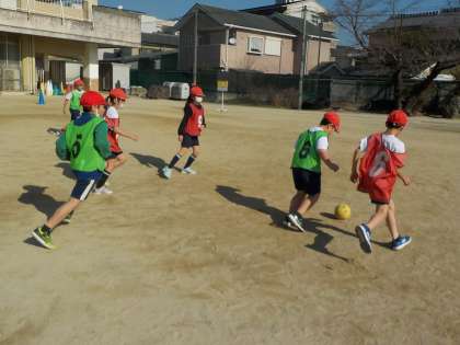 体育科では,「サッカー」の学習を行っています。これまで学習した「エンドボール」や「ポートボール」などの学習を生かして,動きを工夫して取り組んでいる姿がたくさん見られます。「ボールを蹴る」ということは初めてのため,「パスを出すことが難しい」と感じている子もいるようですが,ゲーム中は声をかけ合いながらチームで協力して取り組んでいる様子が見られます。これからの上達が楽しみです。