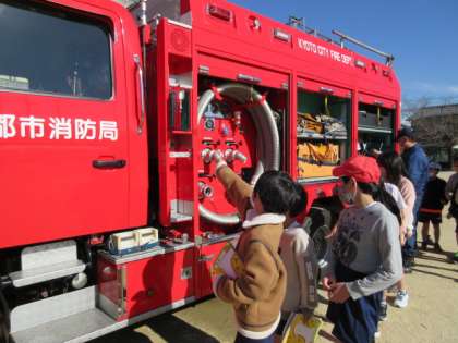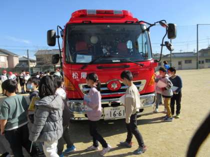 運動場に消防車がきました!消防車を前に、詳しく教えていただき、消防士さんの努力や工夫を知ることができました。みんなでじっくり消防車を見ました。消防車にあるいろいろな仕組みや設備を教えてもらいました。「大きい」「消防車はすごく重いだろうな」など、消防車の大きさやいろいろな設備を、実感をもって観察していました。