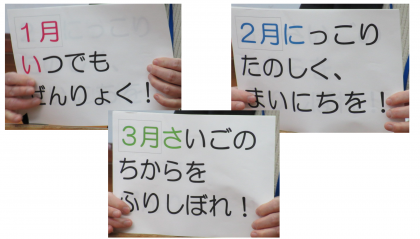 始業式はリモートで行いました。「1月は行く、2月は逃げる、3月は去る」とよく言われます。校長先生は、また、違う言い方で3か月を提示しました。「1月は、いつでも全力、2月は、にっこり楽しく 毎日を、3月は、最後の力をふりしぼれ」です。この言葉を意識して3か月を過ごすと、とても素敵な3か月になりそうです。生活についてお話をしていただく先生からは、「ちょっと頑張ればできそうな自分の目標を立ててみよう」というお話をされました。目標に向かってがんばり、自分の力をジャンプアップできそうな卯年の始まりです。