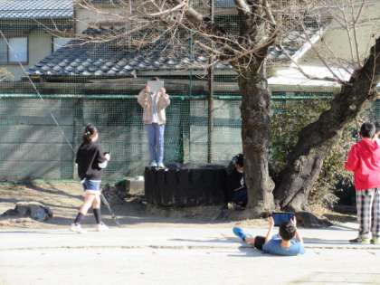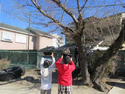 四季を通じて観察をしている木の写真を撮りました。撮影する姿に気合を感じました。写真を撮るためにじっくり観察しているうちに「枝の先に何かある」「つぼみかな」「何か秘密がありそう」など、冬芽に気づくつぶやきが聞こえてきました。