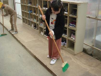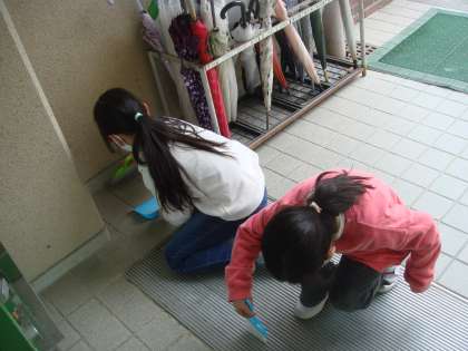 掃除の時間は、班の人と協力して校内をすみずみまできれいにします。誰も気が付かないような所を小さなほうきを使ってはいている人もいました。自分たちの学校がきれいになるのは気持ちがいいですね。