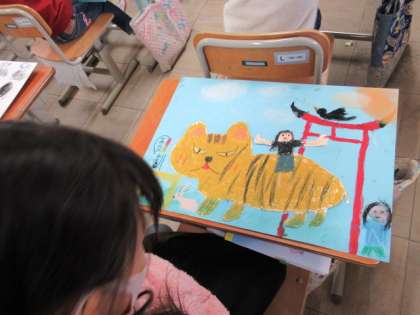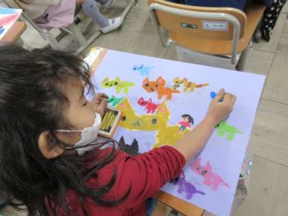 乗ってみたいものや行ってみたい場所を想像して、絵に表しました。動物にのって行ってみたい、という子は、大きく動物を描き、自分が楽しそうに乗っていました。