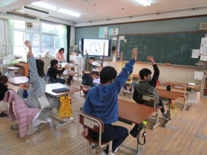 時計の学習をしました。難しいスペシャル問題にも挑戦しました。時計の模型を使って考えました。