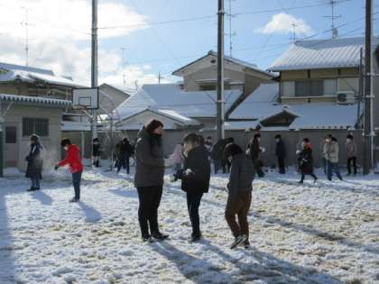 ALTの先生も子ども達と雪を楽しみました。雪合戦は「snow fight」というそうです。先生も子どもたちも一緒に雪合戦をする様子が見られました。