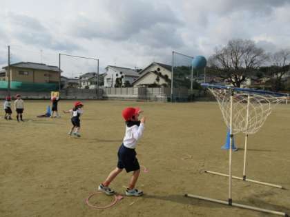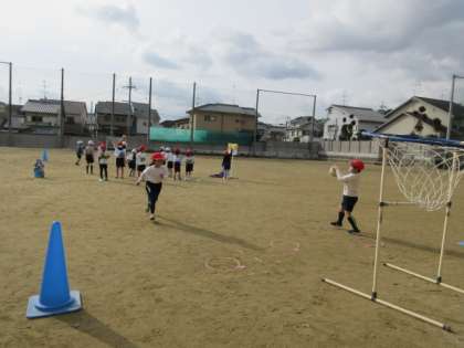 パスやシュートの練習をしました。ボールをいい場所でもらうことができるよう、考えて動ことができました。二人で声をかけあってパスをし合う様子も見られました。シュートをして、入ったらとてもうれしそうにしていました。