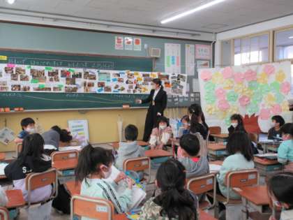 クラスみんなで交流するときも、楽しかったことをみんなで思い出していました。交流で使った付箋紙を大きな木に貼ると、たくさんの花が咲きました。「こんなに思いであったんや。」「こんなたくさんあるとは思わなかった。」というつぶやきが、自然に生まれていました。そして、1年間でたくさんの思い出ができたことを実感していました。「保育園で出来なかったことが、1年生になってできました。」という発言も生まれました。「成長したってこと?」と先生が聞くと「先生が教えてくれたから。」と返事をする子もいました。自分や友だちの成長を、じっくり味わうことができたひとときでした。
