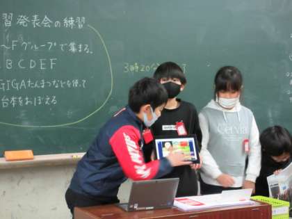 総合的な学習で調べた「京都の魅力」について発表する練習をしました。GIGA端末を使って、写真を示しながら前を向いて話すように練習しました。自信をもって笑顔で話すことができていました。写真があると、説明の中身がわかりやすいです。参観日で、元気に発表しようと思います。