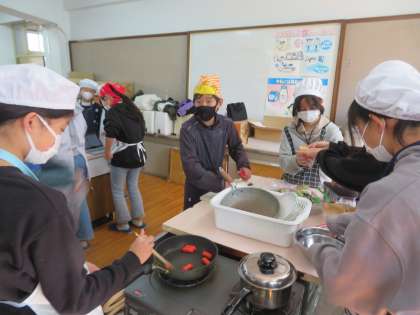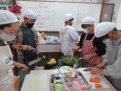 調理実習を行いました。今回は、自分たちで献立を考えて作りました。たくさんの品数がありましたが、みんなで協力しながら、手際よく調理している姿は、さすが6年生でした。