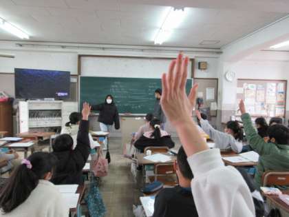 そして、やりたい職業について理由を聞くことで、発表する人が何の仕事をしたいのか、クラスのみんなで考えるようにしました。理由に出てきた英語の言葉を聞き取って、何の職業について話したのか、子どもたちは一生懸命考えて、がんばって発表しました。互いの夢に拍手をしたり、「お〜」と感嘆の声をあげたりして、互いを認め合ったり英語の対話を楽しんだりすることができました。