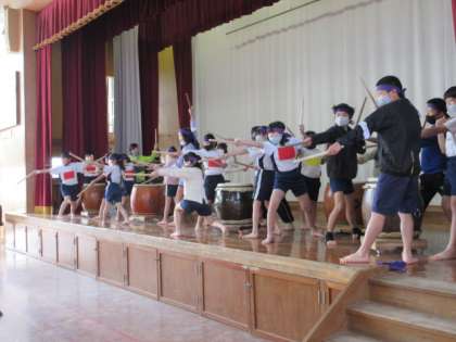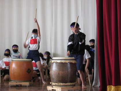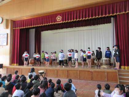 昨日もよかったですが、今日もみんなの演奏はとてもよかったです。気持ちが一つにまとまった、力強い太鼓の音が体育館に響きました。最後のポーズもばっちり。あたたかい拍手をもらいました。松尾小の子どもたち、教職員のあたたかい応援が、部活動和太鼓部の子どもたちの大きな励みになりました。