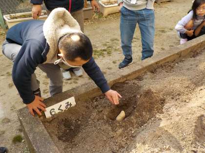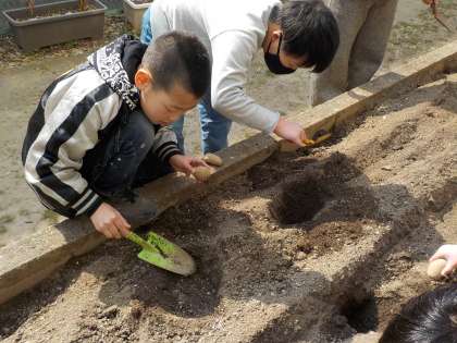 先日、土を準備した畑に種芋を植えました。今年は「きたあかり」と「メークイン」の2品種を植えました。品種ごとに、形の違いや芽の色の違いなど、じっくり観察した後で畑に植えました。すくすく育っていくのが今から楽しみです。