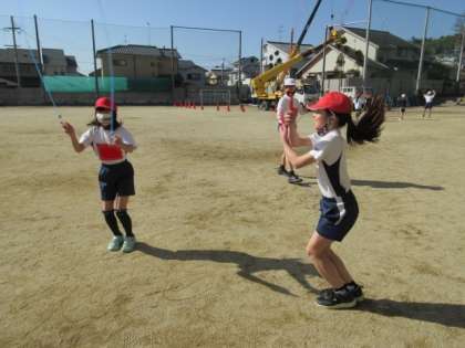4年生の体育は「なわとび」と「持久走」です。なわ跳びでは、目標の跳び方をとぶことができるように、子どもたちは一生懸命頑張っていました。