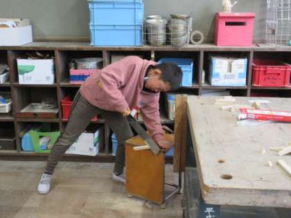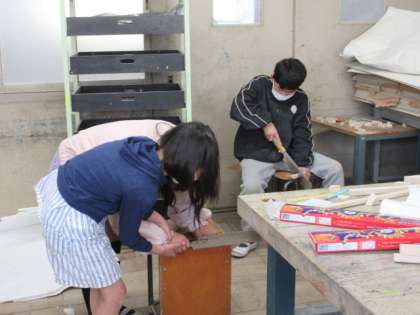 木をのこぎりで切って、釘で合わせて作品をつくることに取り組んでいます。テーマは「生き物」です。子どもたちは、とても一生懸命、ノコギリや金づちを使って製作しています。あっという間に時間が過ぎます。体力を使い切って頑張っている様子がみられます。友だちと力を合わせてアドバイスをし合って、より上手く道具を使うことができるよう、頑張っていました。